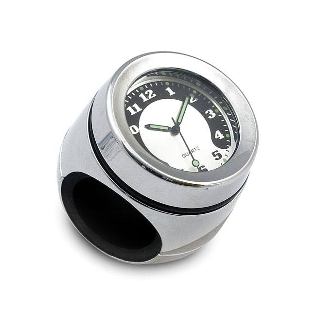 Beskrivelse Handlebar mounted clock. Chrome Fits 1" (25.4mm) and 1-1/4" (31.8mm) diameter handlebars through a removable black nylon bushing. Direct in-line mount to handlebar. Lens diameter approx. 32mm. Requires no wiring. |