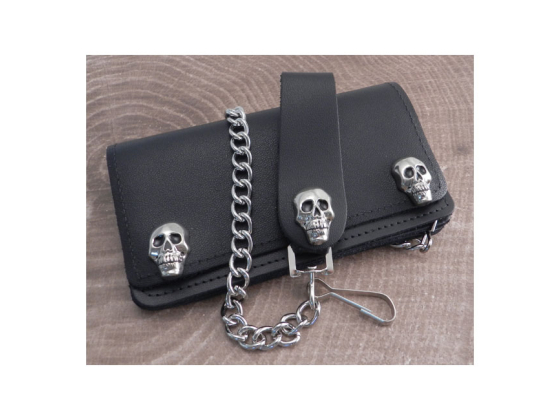 Beskrivelse Amigaz Black Leather Biker Chain Wallet With skull snaps; with zipper change compartment and belt loop wallet chain; measures approximately 6" x 3 1/2"; chain is a little over 12" plus the 3.5" belt loop |