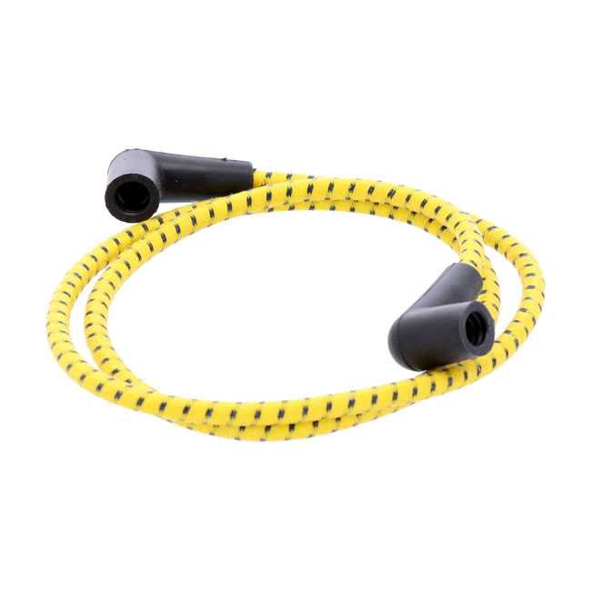 Beskrivelse Universal 40" spark plug wire set. Cotton cloth yellow/black Yellow with black tracer. Universal 'Cut to length required'. 40" (100cm) copper core spark plug wire in 7mm diameter silicone, with 2 pre-attached silicone plug boots and separate coil boots & terminals. Thin enough to look authentic, thick enough to give total reliability. The outside is wrapped in vintage braided multi-color cotton cloth to give it more soul than anything out there. Cut to length required. Complete with coil boots and terminals. Note: Compatible with points ignition only. Fits: > Universal with pre-1999 style coil |