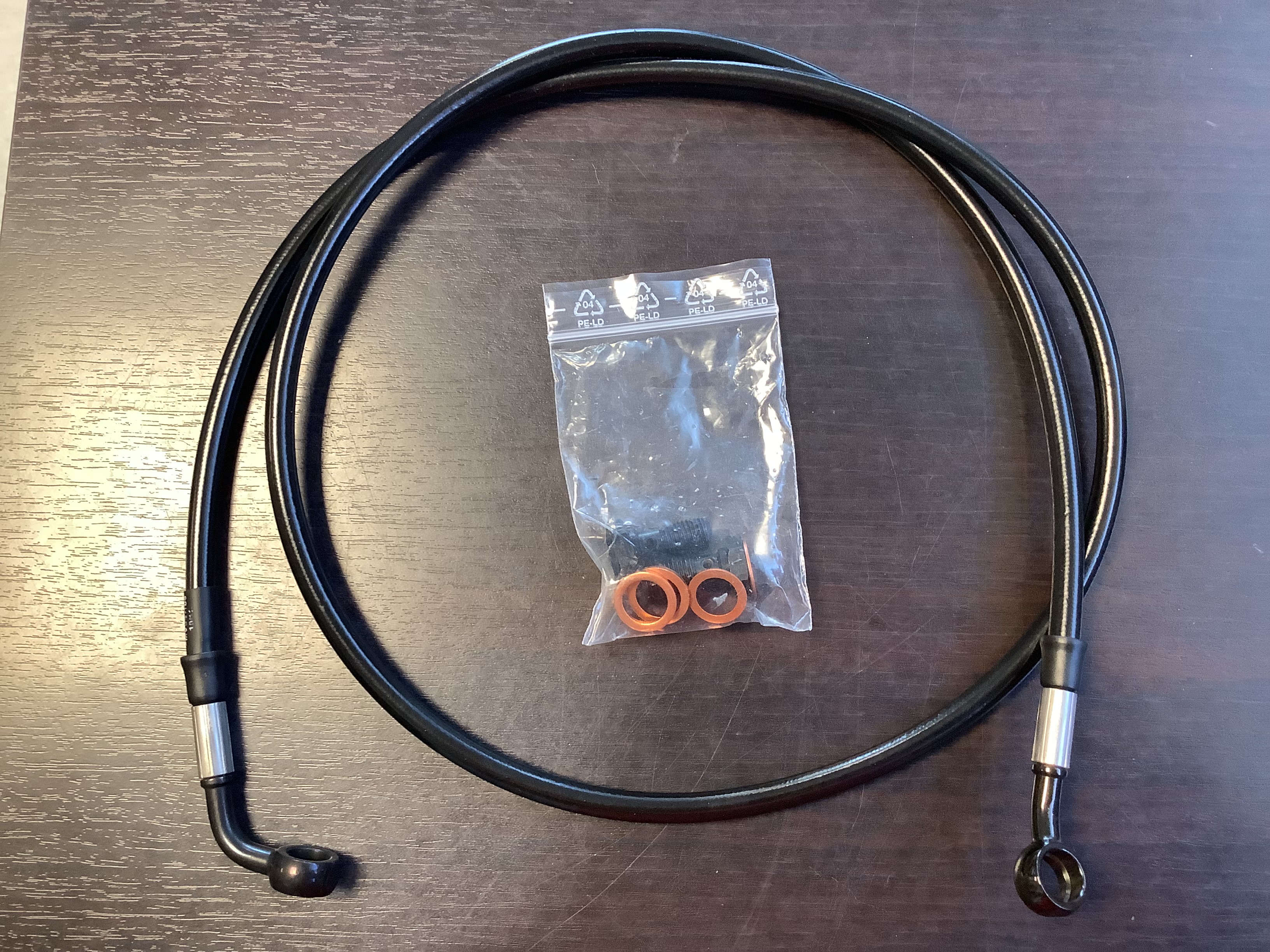 Beskrivelse Pre-fabricated brake line kit with TUV approval. Designed for use in all custom and stock applications. Black coated stainless steel. - 47" total lengde med bajo. 3/8"24 i 80 grader 7/16"24 i 20 grader Fits: > Custom and stock applications |