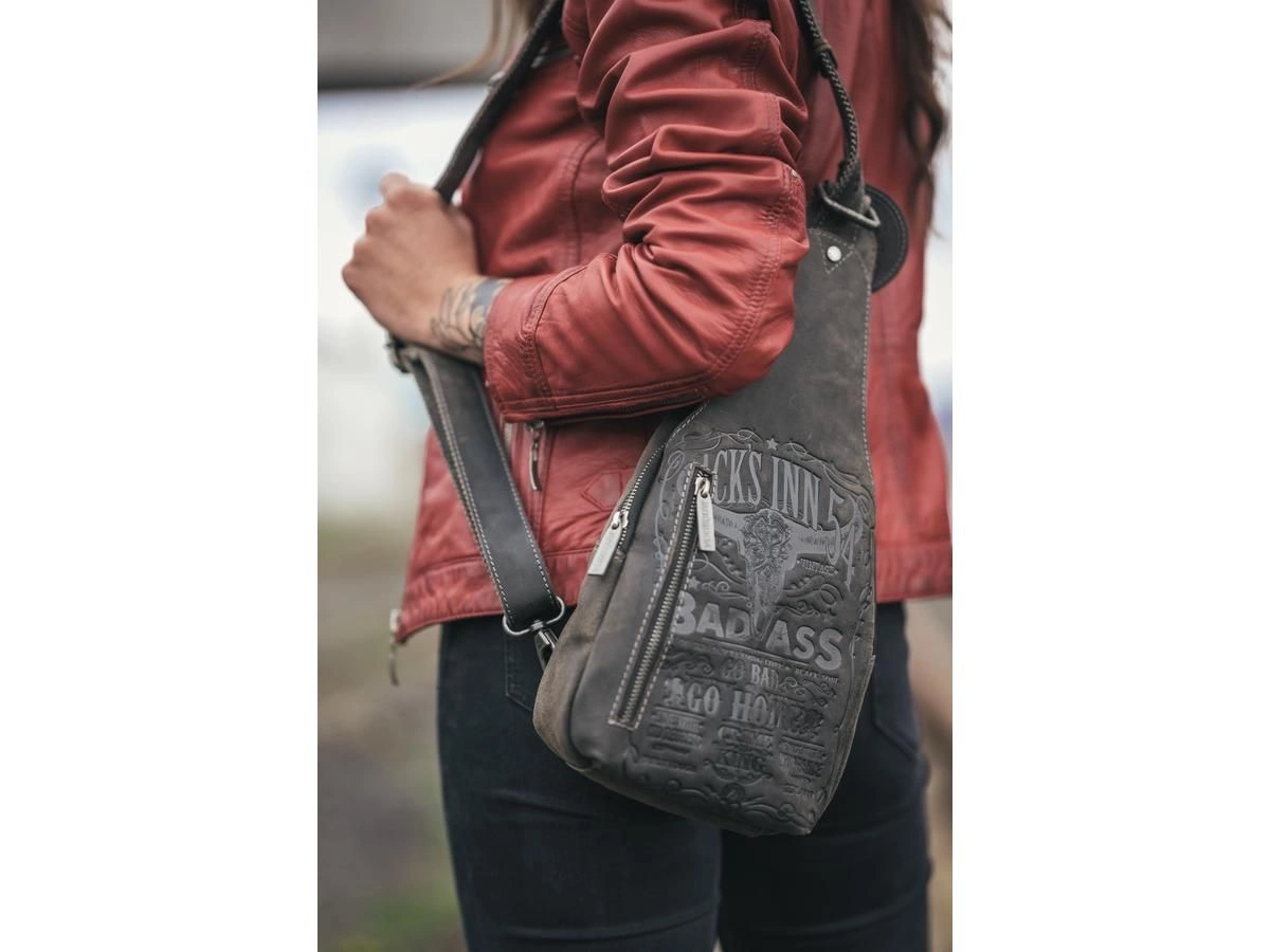 Beskrivelse Description The Revenge Body Bag will be your faithful companion for all things fun: At festivals, on vacation, shopping or going for a walk. So you have your hands free for the really important things in life. The special feature of the bag is that the strap can be fastened at the bottom using the carabiner on the side of your choice. Thanks to the different carrying options, you can always carry your small valuables comfortably and, above all, close to your body! Body bag Revenge made of full-grain cowhide with Bad Ass logo With extendable shoulder strap up to 110 cm Shoulder strap with carabiner, different carrying options 1 small zipped compartment on the front 1 large inside pocket with zipper and small one with Velcro fastener Inside pocket: zipped compartment, small carabiner, cell phone pocket, Jack's Inn 54 logo 1 small zipped compartment at the back / on the back Jack's Inn 54 logo embossed on the back Outer dimensions: 36 x 19 x 5 cm Inside dimensions: 22 x 15 x 4 cm Note: Leather is tanned animal skin - a natural product. Irregular grain and possible abrasion of the color are not defects of the product, but a guarantee for the authenticity of the finely polished leather and the vegetable tanning. Traces of use, such as scratches, are also part of the intended look of brand-new bags and do not constitute a defect.It is typical for this leather to show signs of wear after a short time. It is recommended that you do not use any care products at the beginning, as this is a desired effect. Sufficient protection is provided as the leather is oiled and/or waxed. |