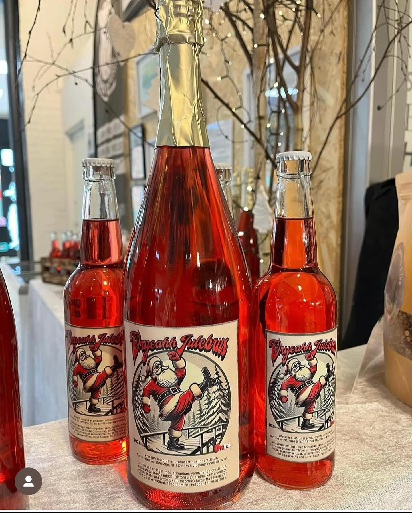 Beskrivelse Øreyeahh Julebrus produsert hos innerst i elva Ørje. Julebrusen er helt nydelig på smak. MÅ bare prøves. Laget av bringebær, vann, hylleblomstsirup, surhetsregulerende middel(sitronsyre) aroma, konserverings-midler natriumbenzoat, kaliumsorbat. Farge fra lilla gulrot. 10,5g sukker/100ml Etiketten er tegnet av Eirik Hammer. Nissen gjør "sillywalk" akkurat som Mannen på fotgjengerskiltet i sentrum av Ørje. |