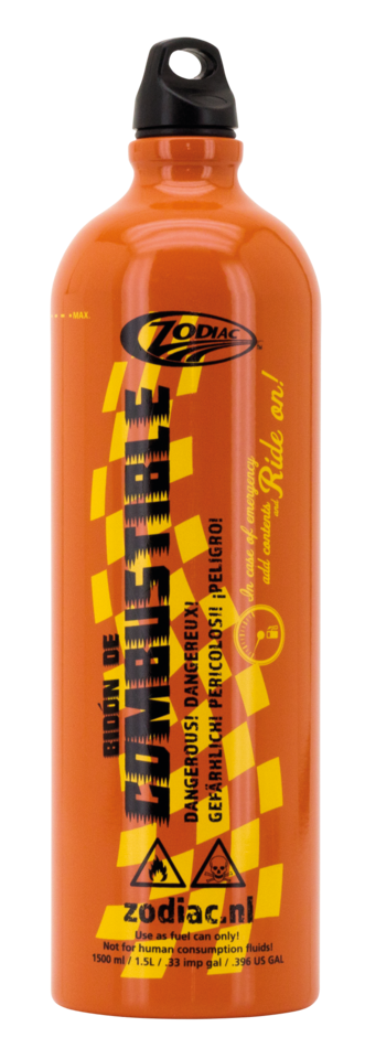 Beskrivelse Fuel bottle 1,5 L This Zodiac exclusive 1.5 litres reserve bottle may be the cheapest and best insurance policy you will ever buy. Features a durable ABS cap with a slot for a dummy cord or carabineer that uses an o-ring to stay sealed and safe. At 12 1/8"x3 1/2" (31x10cm) it is the biggest auxiliary container we have found and still easily fits in a saddle bag or backpack. Or go for the fuel bottle with one of the Zodiac exclusive Texas Leather real leather fuel bottle holders that straps easily to your bike. Also easy to strap to one of the Texas Leather bags with fitted mounting straps. Note: Made for gasoline, NOT food or water safe! |