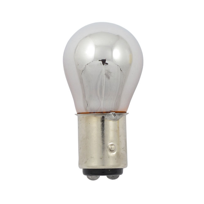 Beskrivelse Light bulb #1157. 12v 21/5w. Amber glass/chrome - Amber light with mirror-like glass - #1154 style - 12V 21/5W - Dual filament - For taillight (taillight/brake light) use and similar |