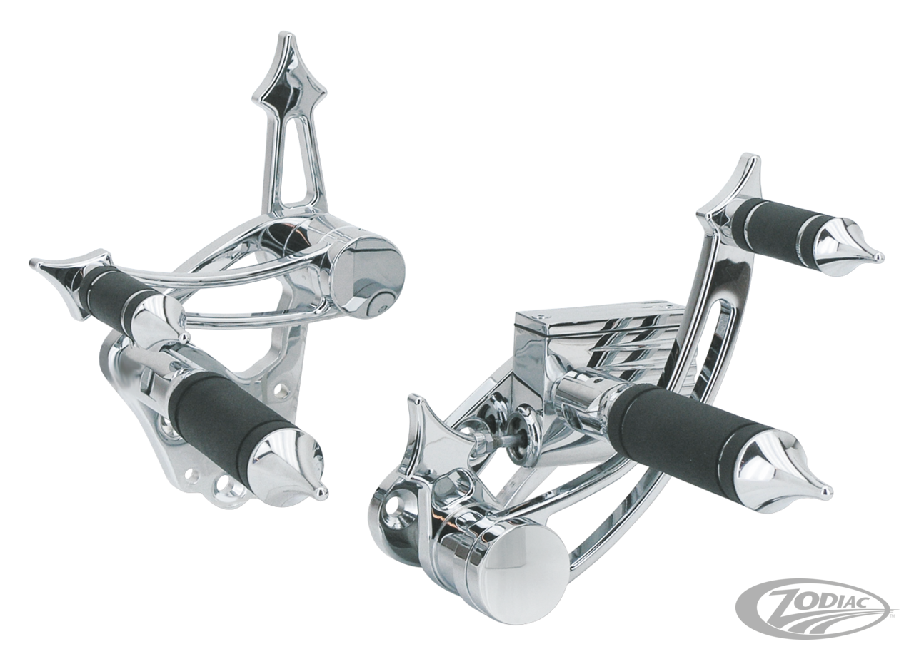 Beskrivelse Gladiator-foroverkontroller er laget av billett-aluminium av flykvalitet med en utsøkt kromfinish og unike fot- og girplugger. Settene inkluderer en Kelsey-Hayes type hovedsylinder med 5/8"-boring i aluminium, fot- og girplugger utstyrt med gummibånd. Bremsepedalen og girspaken kjører på bronsebøssinger for jevnere og anti-slitasjedrift. Selv om deres svært eksklusive utseende har disse Settene passer til alle 4- og 5-hastighets Evolution Softail-modeller samt alle 4-hastighets FX- og FL-modeller fra 1958 til 1986. Merk: På noen FXE-modeller fra 1980 til 1984 er det kanskje ikke montert høyre sidemonteringsflik . modeller krever installasjon av den påsveisede monteringstappen ZPN 233527. |