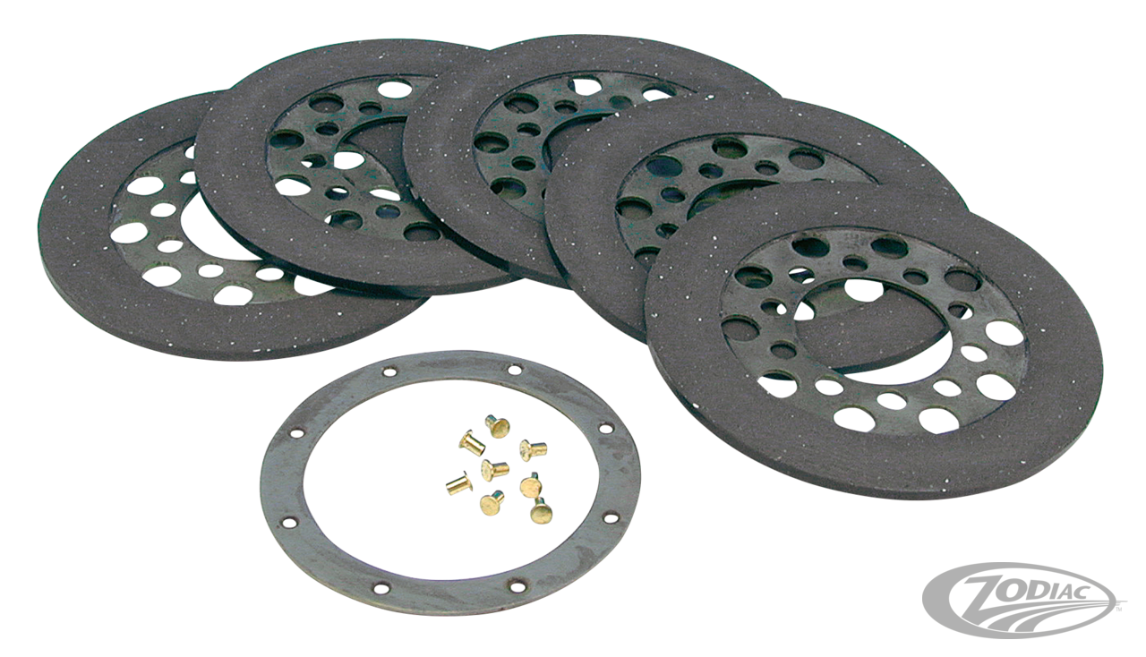 Beskrivelse Zodiacs berømte Full Plate clutchsett for alle Big Twin 1968 til 1984. Settet inkluderer 5 fullfriksjonsplater (OEM 37850-68) og clutchnavforingen med nagler (OEM 37549-41A). Fungerer vått eller tørt. |