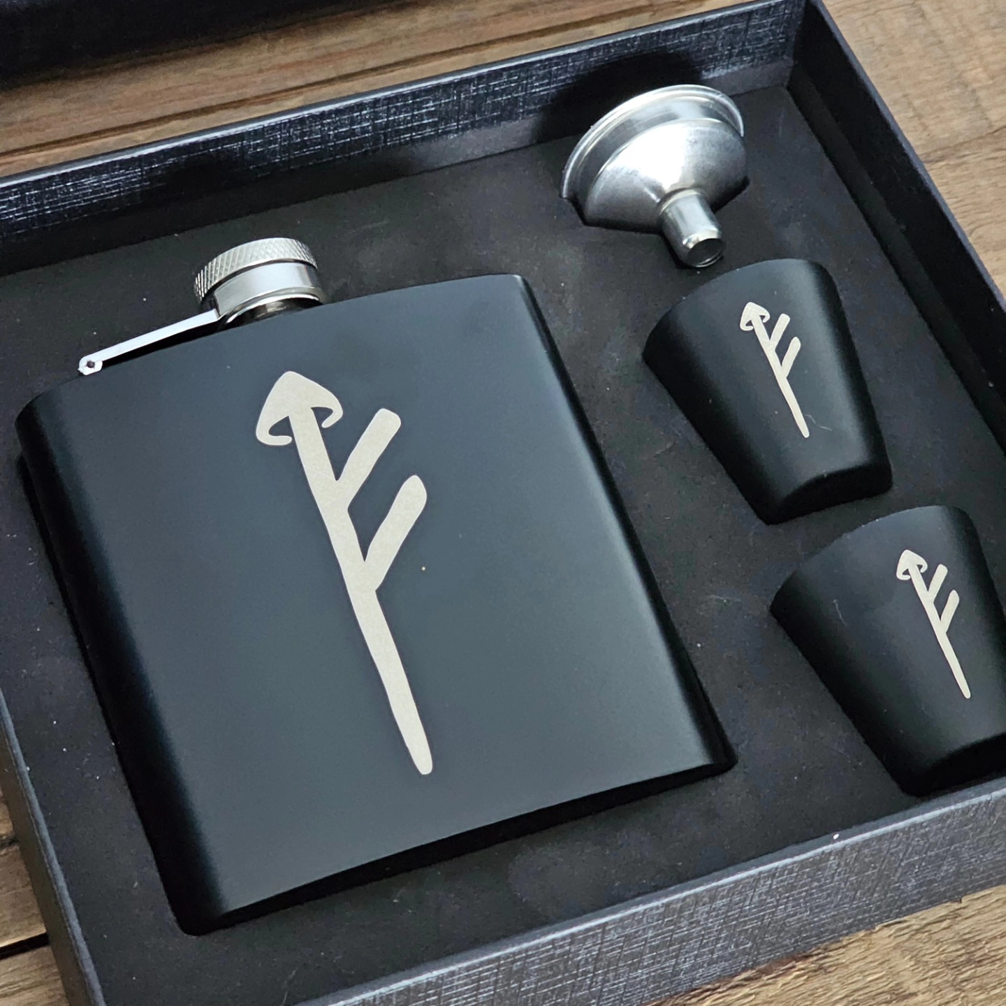 Fleinsopp lommelerke med to stk drikkebeger og påfyllings trakt. kommer i en gave etui.