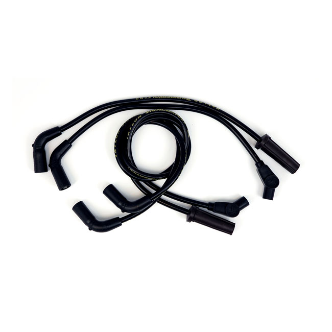 Beskrivelse Black wires with gold lettering. Plug & coil boots are black. 4-wire set. Includes one 34" 180° plug & 135° coil + one 30.5" 90° plug & 135° coil (front) and one 18" 90° plug & 135° coil + one 17.25" 180° (straight) plug & 135° coil (rear). According to Taylor these are the best spark plug wires money can buy. Made of a 40 Ohm/ft. Ferrite spiral core with a blend of copper nickel alloy which is bonded by a conductive acrylic cover. Feature two layers of pure Zimplex silicone for 600°F (315°C) heat protection. Excellent RFI and EMI suppression and compatible with most ignition systems and electronic components. Comes with 100% silicone plug boots with double spring locking spark plug terminals that will resist vibrations. Note: Compatible with all H-D ignitions. If you have an aftermarket ignition, please check with manufacturer's ohm requirements. For very high ohm ratings you can use Taylor's Carbon Core wire sets. For magnetos and point ignitions Taylor's metallic core wire sets are recommended. Fits: > 17-23 M8 Touring; 17-23 M8 Trikes |